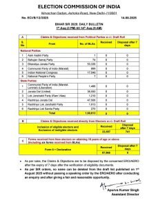 बिहार, निखिल दुबे : चुनाव आयोग ने आज सुबह बिहार मतदाता पुनरीक्षण कार्य की जानकारी देते हुए बताया कि आम मतदाताओं के अभी तक सुधार के लिए 23 हजार 557 आवेदन प्राप्त हुए हैं। बिहार मतदाता सूची प्रारूप प्रकाशित होने के बाद सियासत जारी है। विपक्षी दल लगातार कर मतदाता पुनरीक्षण कार्य पर सवाल उठा रहे हैं। लेकिन 1 अगस्त को मतदाता सूची प्रारूप प्रकाशित होने के बाद अब तक किसी भी राजनीतिक दल की ओर से आपत्ति नहीं दर्ज करवाई गई है।