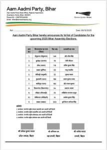 पटना, शशिकांत मिश्रा : बिहार चुनाव की तारीखों के ऐलान से ठीक थोड़ी देर पहले आम आदमी पार्टी ने बिहार विधानसभा चुनावों के लिए 11 उम्मीदवारों की पहली सूची जारी कर दी है. बिहार विधानसभा चुनाव 2025 की सरगर्मियों के बीच आम आदमी पार्टी ने अपनी पहली उम्मीदवार सूची जारी कर सियासी समीकरणों को हिला दिया है. आम आदमी पार्टी इंडिया गठबंधन से अलग होकर स्वतंत्र रूप से चुनाव लड़ने का ऐलान कर चुकी है.